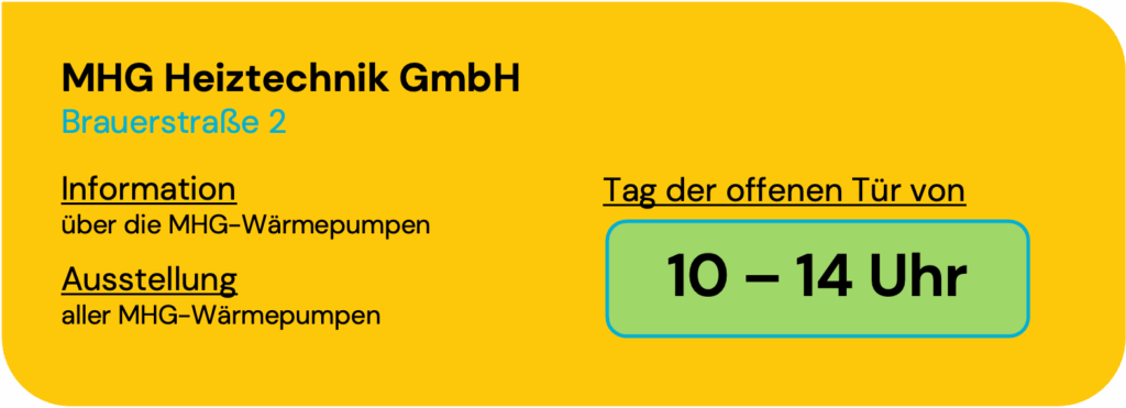 Darüber hinaus öffnet der lokale Wärmepumpenhersteller MHG Heiztechnik GmbH anlässlich des „Tages des offenen Heizkellers“ seine Pforten in der Brauerstraße 2. Dort können Sie sich am Sa., 15.11.2025, von 10 bis 14 Uhr – auch ohne Anmeldung – über die MHG-Produkte informieren und sich auch vor Ort aufgebaut anschauen.